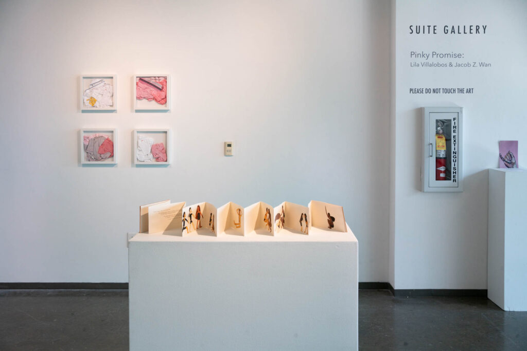 Pinky Promise follows the heartline through interpersonal relationships and self-love, conceptually exploring the associations and intimacy of lovers, as well as the narratives of inner monologues. Color is used to evoke tenderness and trust, centering the show around ties that bind us to others. Jacob Z. Wan is a Florida based bookbinder who employs text, story, and collected objects to process personal growth and maturation that blooms into self-love. As a gay Chinese man, he hopes to inspire resilience and self-compassion in marginalized individuals. Currently based in Georgia, Lila Villalobos creates archetypes drawn from their experience. Their flat and cartoon-like figures portray inner worlds where feelings and events are filtered and translated into an undulating mindscape.