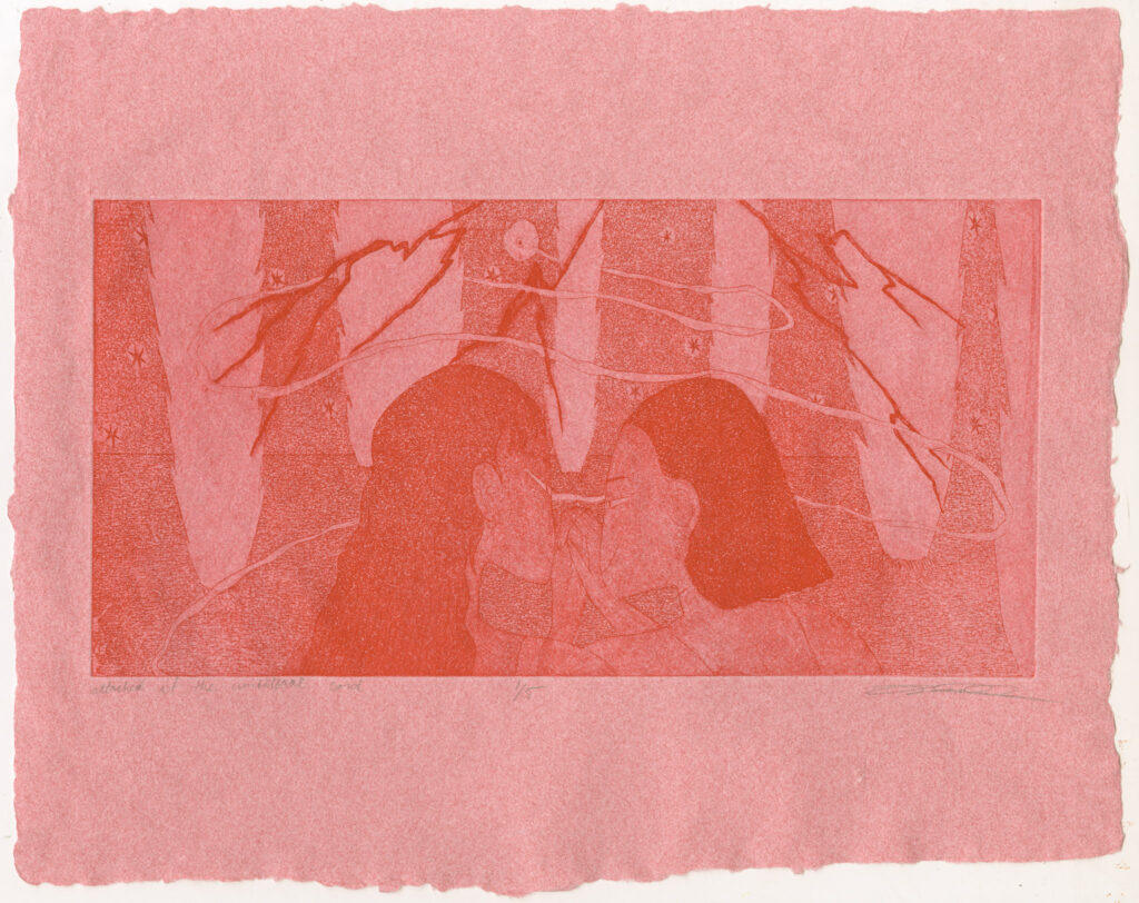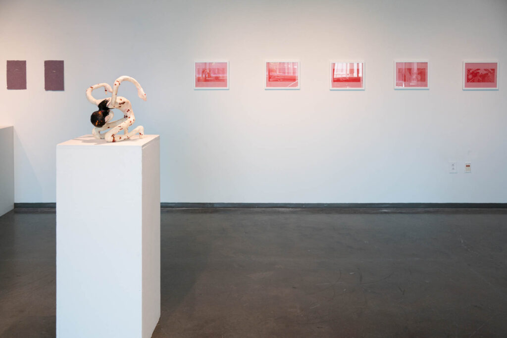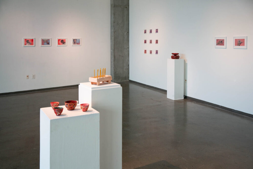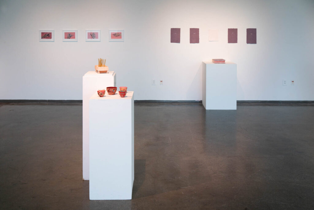 Drawing on their own reminiscence, Jacob Wan and Dodd MFA candidate, Lila Villalobos create parallel narratives in their work. Through visceral color and gentle textures, Villalobos’ and Wan’s work embodies humanness and how love and experience shapes one’s understanding of the world. The concept of the self is traced through each artist’s life through found objects and pictorial reminiscence. Pieces work together to evoke sentimentality, personal evolution, queerness and affection. The artist’s energy is prevalent in their similarly sized flat works. The prints and painting oppose each other in their intensity and motion while communicating similar facets of vitality and connection. Compassion and empathy are born from friendship and love. The artists hope to engage their audience in closeness, communion, and connection with a reminder of interconnectedness throughout their lives and community. In holding space through representation, this show aims to begin the mending of wounds and challenge each viewer’s narratives of themselves.