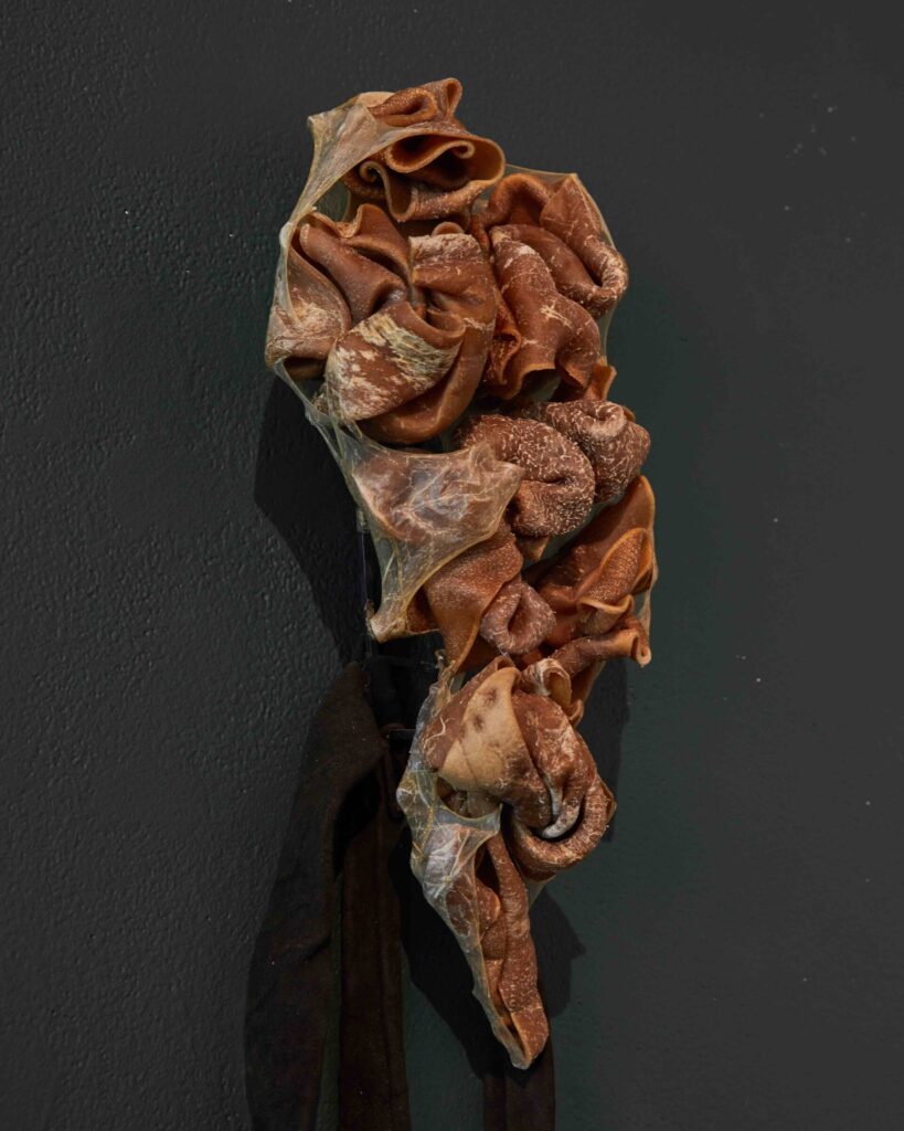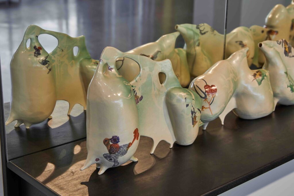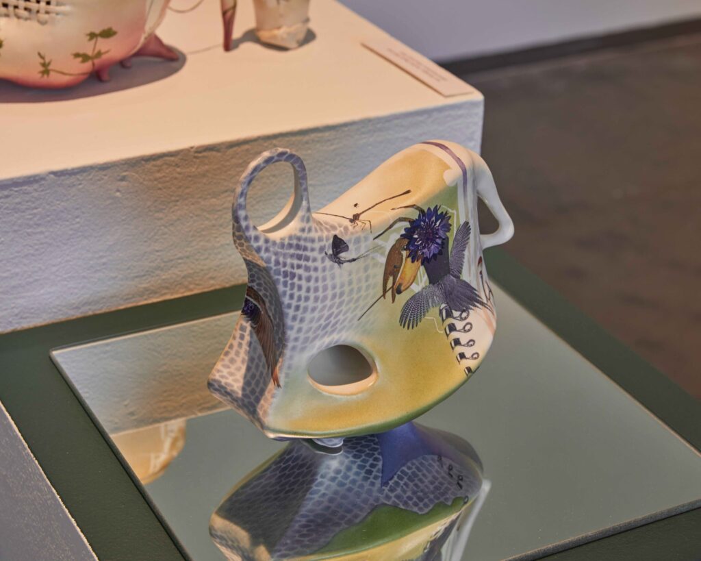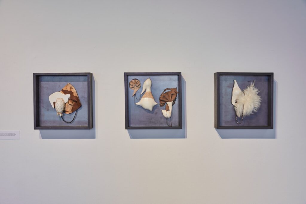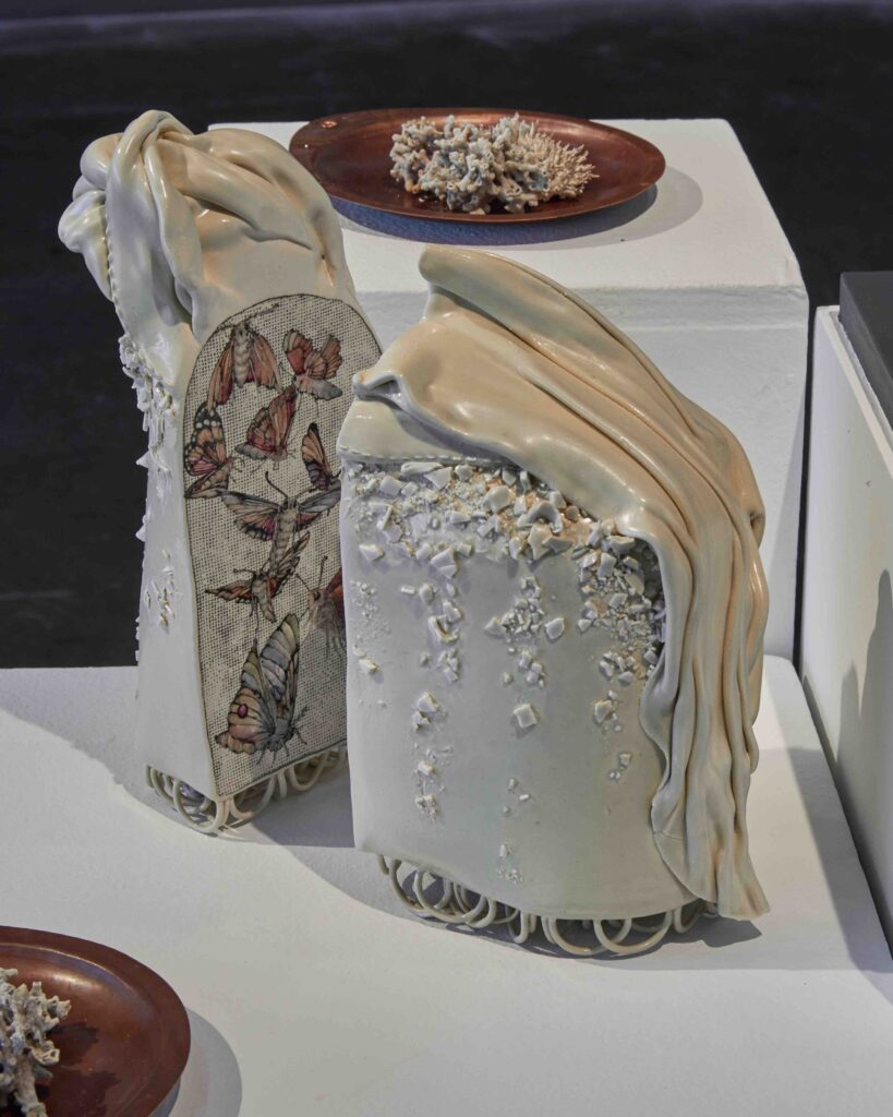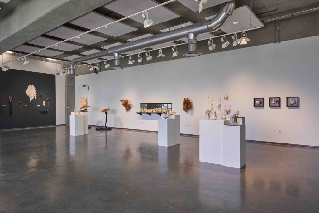 In Taking Care, Jane Ritchie, Dodd Graduate Advisor, and Isys Hennigar, Dodd MFA candidate, consider the complex ways in which humans engage the living world. The works in the exhibition explore the language of care through slow processes, delicate balances, meticulous adornment, and attention to the fragility of living things. The tangled narratives of Hennigar’s ceramic work interweave organisms, vessels, and tools used to mediate human relationships with other species. Ritchie uses a variety of materials from pelts to metal to explore animals as commodities, investigating the ways in which various species are culturally regarded. In exhibition, the works are staged in such a way to recall early museums and objects as “curiosities.” Through layered associations and suggestions of collectively familiar forms, this collaborative exhibition makes visible the inextricable links between the human and the animal.