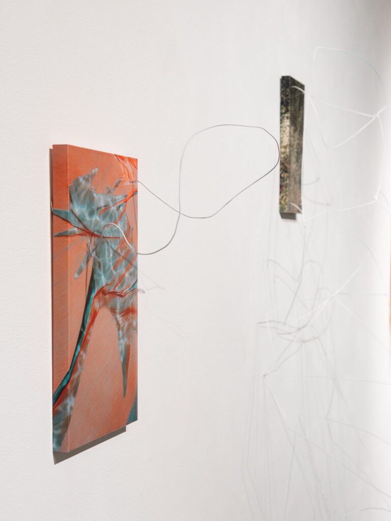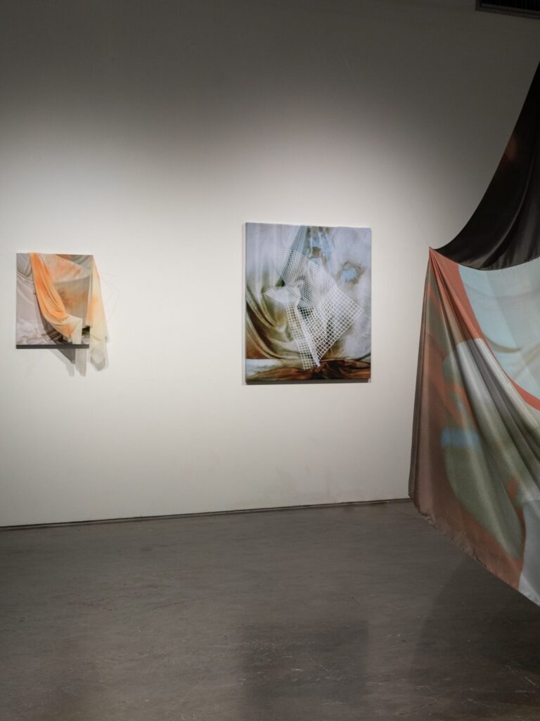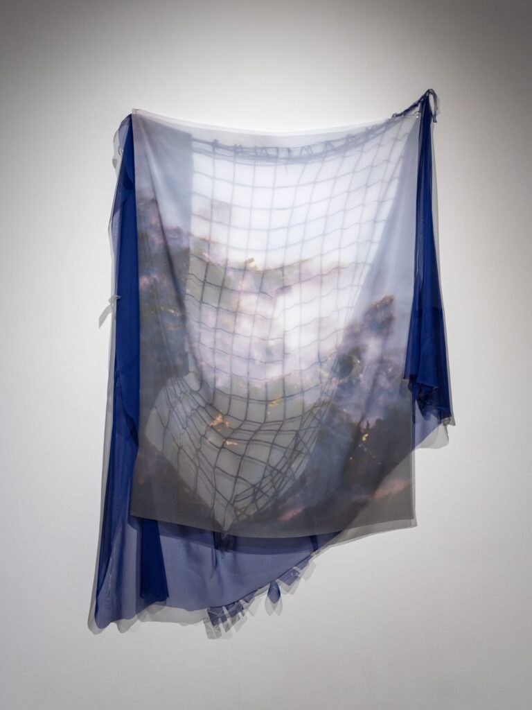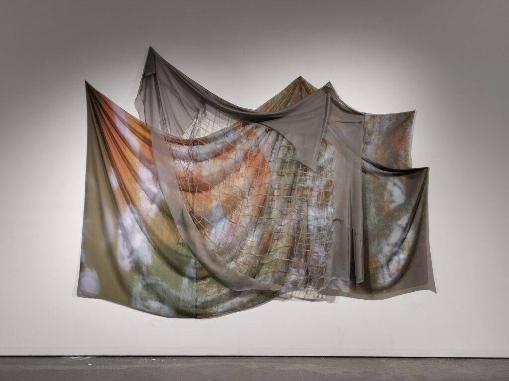 Using an intentionally cyclical process, the work blurs media divides between photographs, sculpture, and installation. Kudzu and chlorinated pools fold in upon themselves in silk forms, with slices of landscape becoming disassociated and blurred. Panel-mounted photos exude wire armatures that break apart in repeated lines. The hard and soft encounter each other in moments of draping; wire nudges aside fabric to reveal the image underneath.