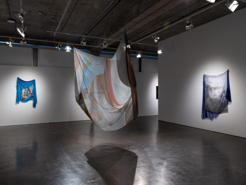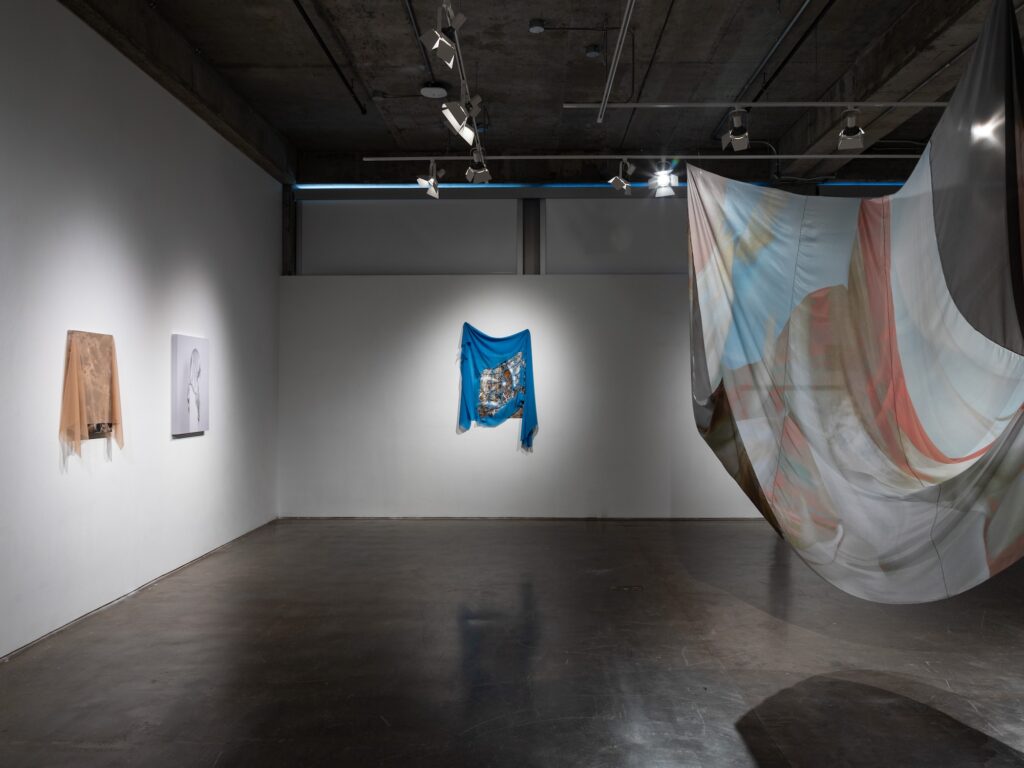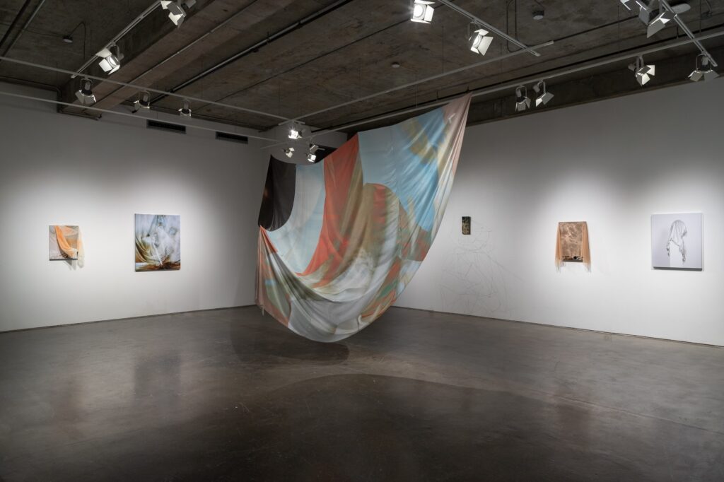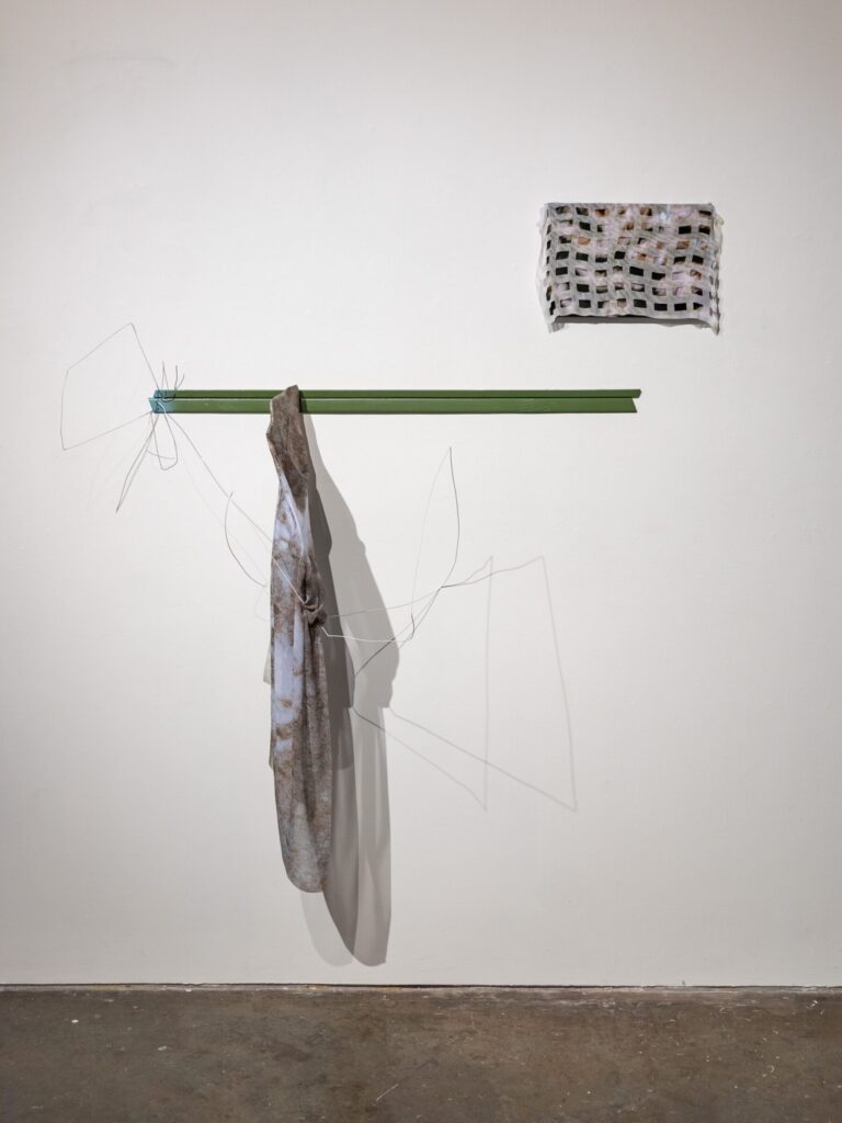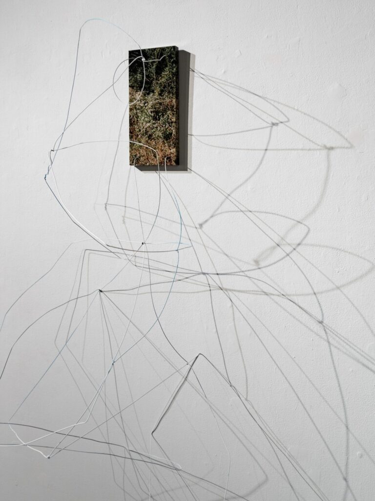 Using an intentionally cyclical process, the work blurs media divides between photographs, sculpture, and installation. Kudzu and chlorinated pools fold in upon themselves in silk forms, with slices of landscape becoming disassociated and blurred. Panel-mounted photos exude wire armatures that break apart in repeated lines. The hard and soft encounter each other in moments of draping; wire nudges aside fabric to reveal the image underneath.