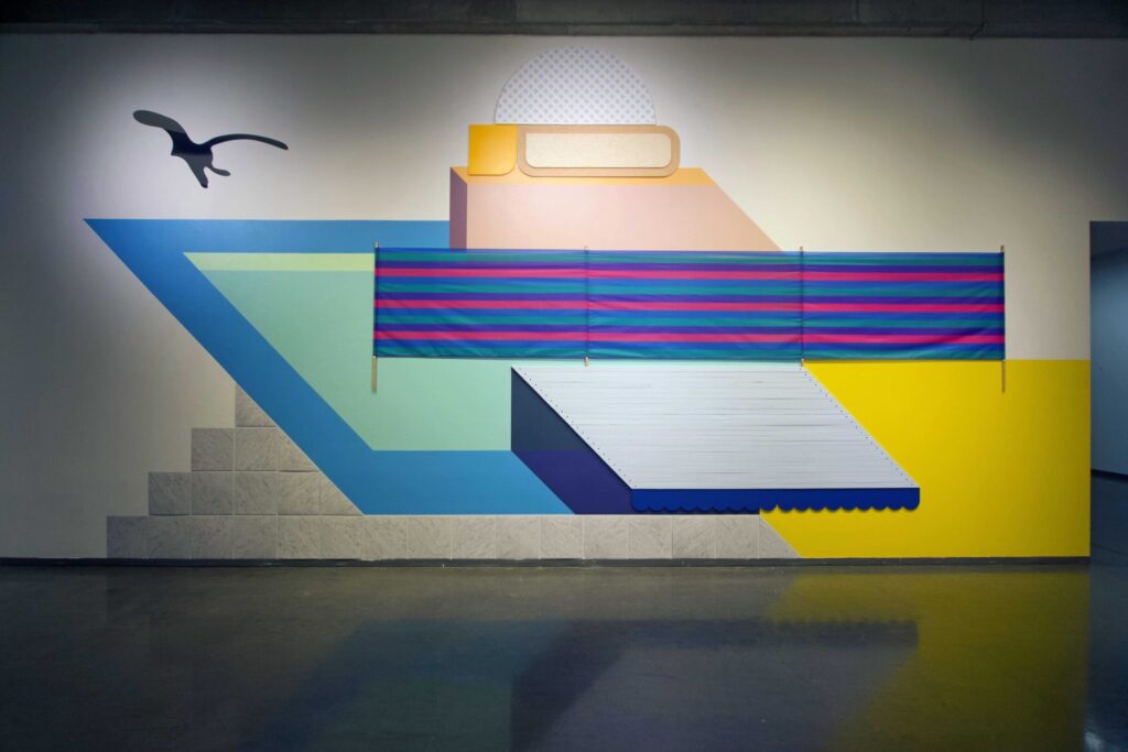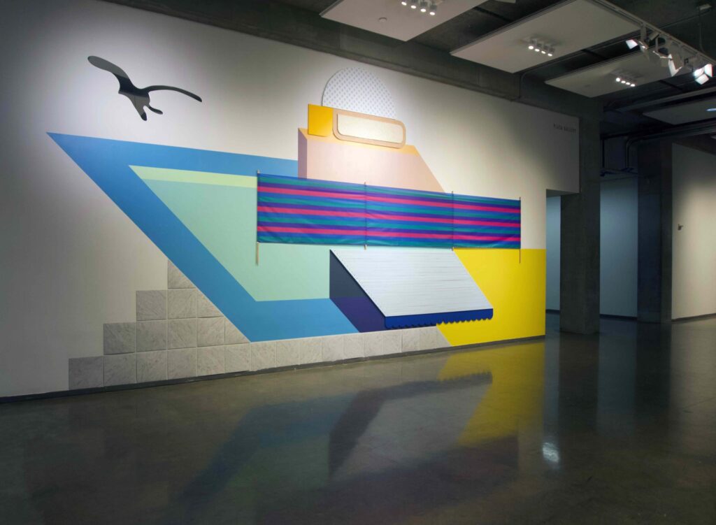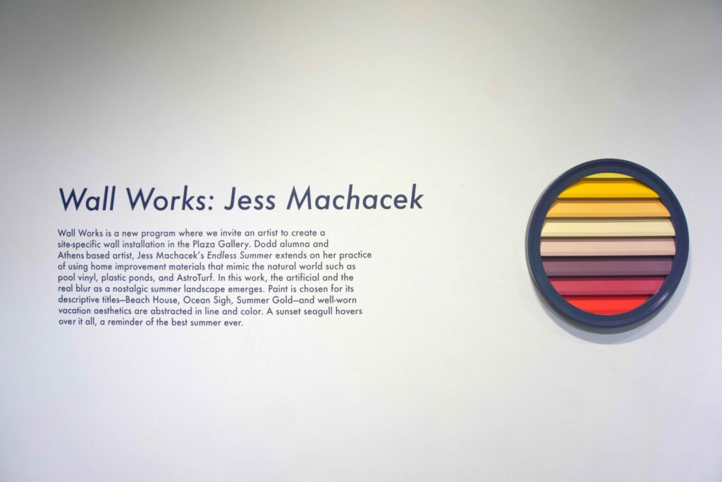 Wall Works is a new program where we invite an artist to create a site-specific wall installation in the Plaza Gallery. Dodd alumna and Athens-based artist, Jess Machacek’s Endless Summer extends on her practice of using home improvement materials that mimic the natural world such as pool vinyl, plastic ponds, and Astroturf. In this work, the artificial and the real blur as a nostalgic summer landscape emerges. Paint is chosen for its descriptive titles—Beach House, Ocean Sigh, Summer Gold—and well-worn vacation aesthetics are abstracted in line and color. A sunset seagull hovers over it all, a reminder of the best summer ever.