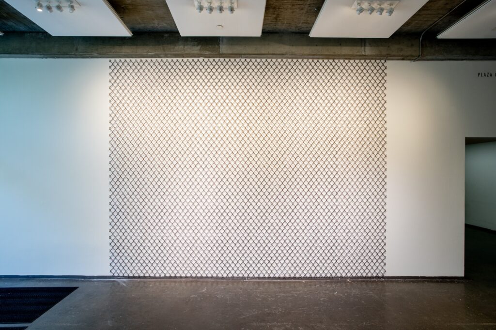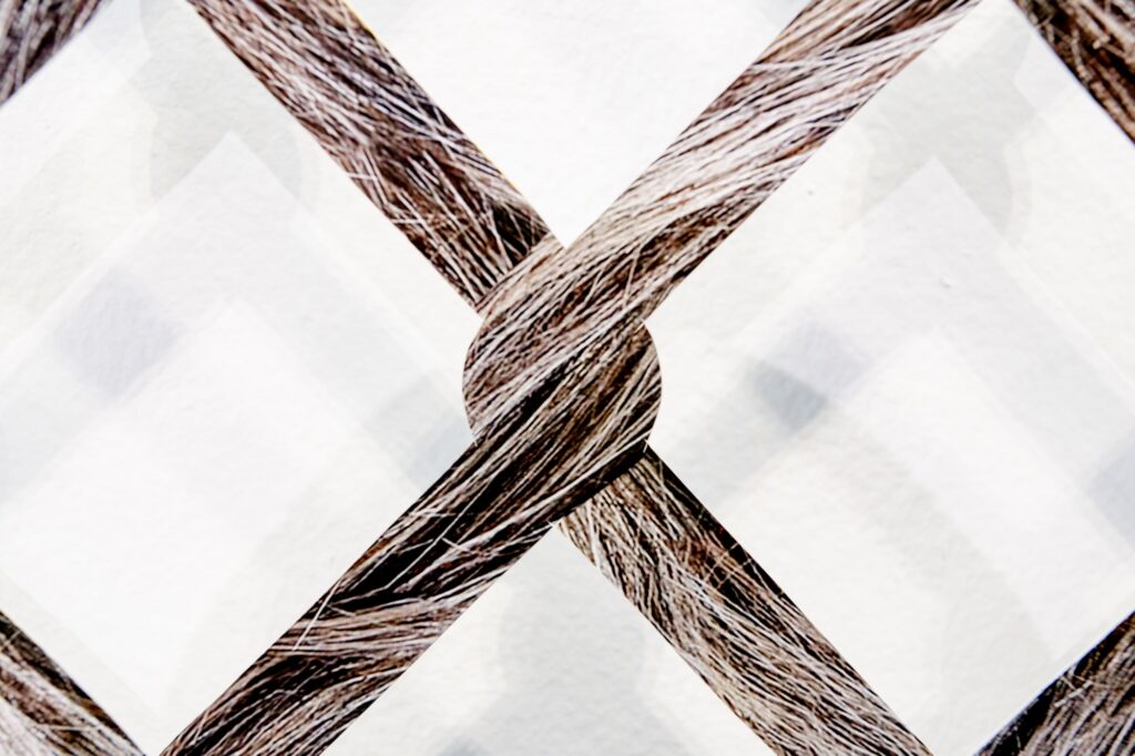 Using her own hair as a foundational image, Athens-based artist Kathryn Réfi weaves organic and irregular material into the familiar pattern of a manufactured chain link fence, creating a tension between softness and rigidity. Réfi creates unsteady ground for the viewer as she plays with perceptions of three dimensionality and flatness. Her body is transformed into a barrier as she contemplates ways in which we hold ourselves back, both mentally and physically. While the artist becomes the obstacle, she also points to a way out. The walls we put up for protection and self preservation are ultimately absurd in their self-destruction.