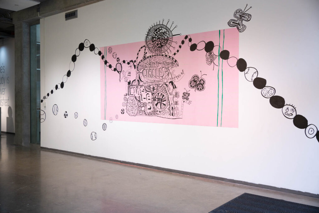 Wall Works is a program at the Dodd Galleries where we invite an artist to create a semester-long, site-specific installation in the Plaza Gallery. Dodd MFA candidate, Luka Carter, presents Workbook, a mural which imagines a start from zero as pages from a notebook full of crooked lines given to a child.