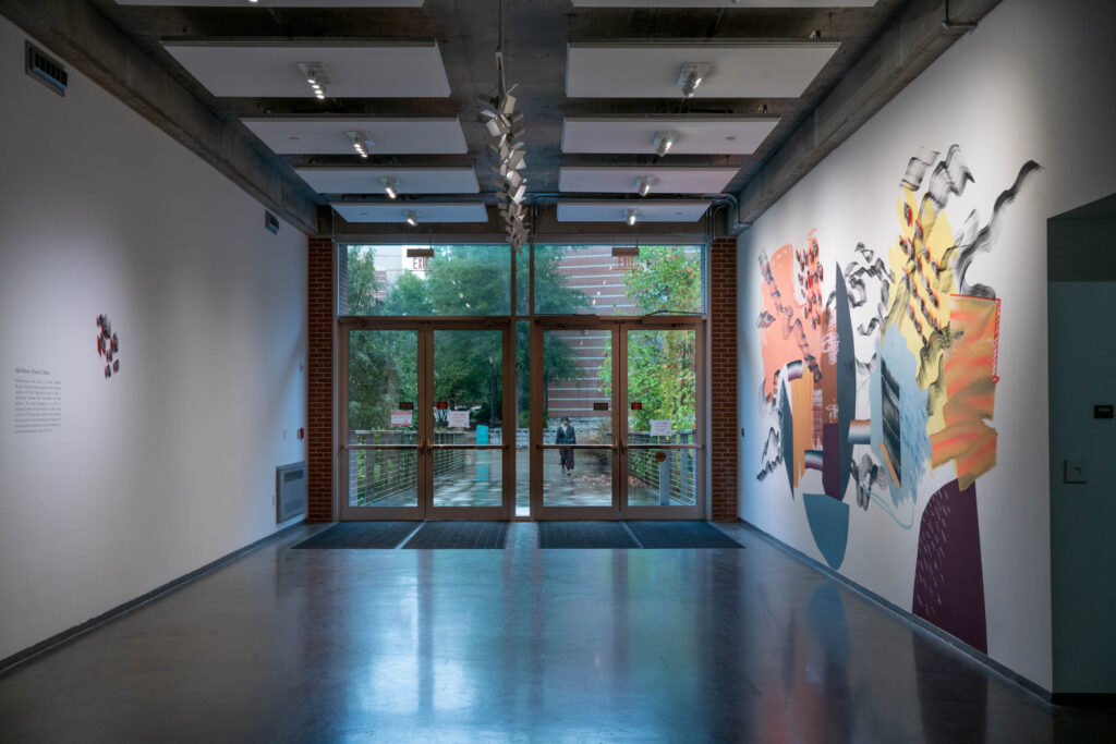 Atlanta-based artist Stacie Rose’s site-specific Shatter, Recoup, Repeat employs gestural mark making, process, and hard geometric lines improvisationally, allowing each element of the structure to respond to another element in a continual play between color and form.