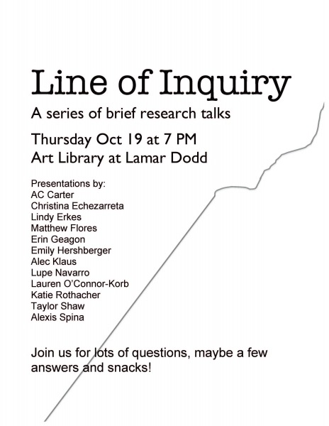 Oct 18 Line of Inquiry: A Series of Brief Research Talks October 18th, 2017 at 8:00 pm Art Library October 18th, 2017 at 8:00 pm Art Library