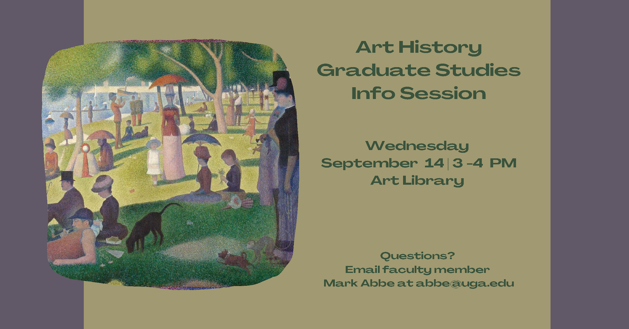 Sep 14 Art History Graduate Studies Info Session September 14th, 2022 at 3:00 pm 2nd Floor, Lamar Dodd School of Art | Art Library September 14th, 2022 at 3:00 pm 2nd Floor, Lamar Dodd School of Art | Art Library