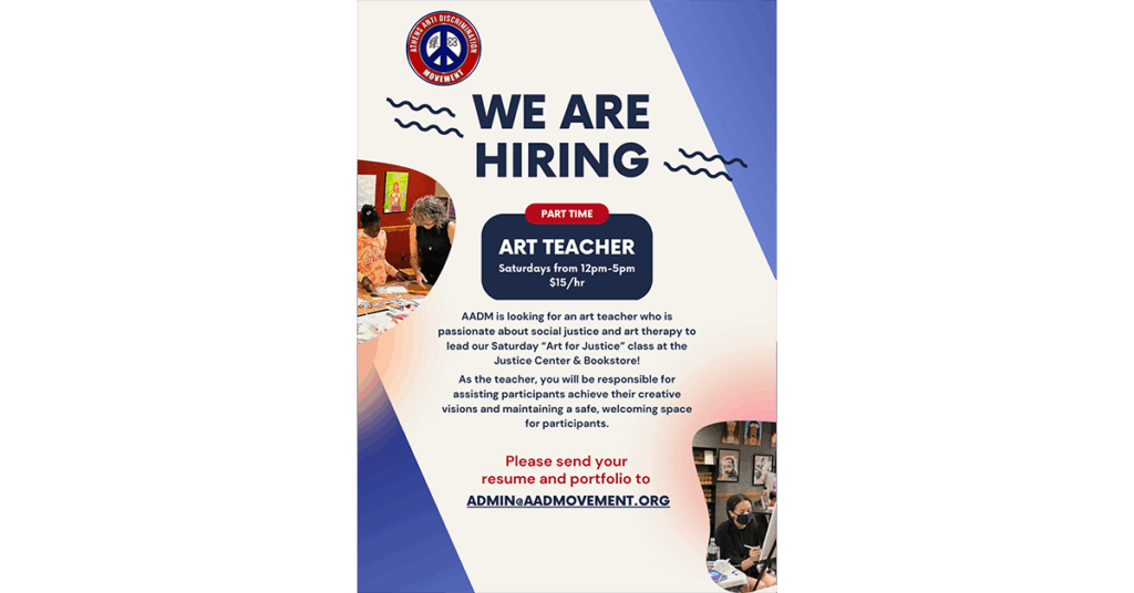 The Athens Anti-Discrimination Movement (AADM) is looking for an art teacher who is passionate about social justice and art therapy to lead our Saturday “Art for Justice” class at the Justice Center & Bookstore at the Georgia Square Mall. The class is open to anyone who is interested regardless of age and is intended for participants to unwind and express themselves creatively. It is free, though donations are highly encouraged, and all art supplies are provided by AADM.