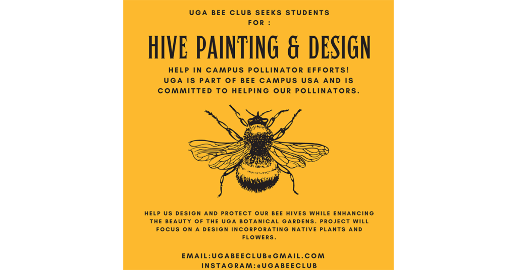 The Undergraduate Bee Club at UGA is looking for students to help decorate and paint hive boxes. We are working to place a couple beehives at the Botanical Gardens and on the Geography Building. Painting the wooden hive boxes is crucial to protecting them from weathering, but we also want to enhance the beauty of the gardens while bringing attention to out pollinators.