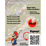 Seeking volunteers to help with painting two murals at the Bigger Vision Community Shelter. We need volunteers the morning of January 16th, 17th, 19th, and 21st. Please sign up for whatever day(s) and time(s) that work best for your schedule. We will be figuring out carpooling and shuttling due to limited parking. This is a greatContinue reading "Volunteer Painters | Bigger Vision Community Shelter"...
