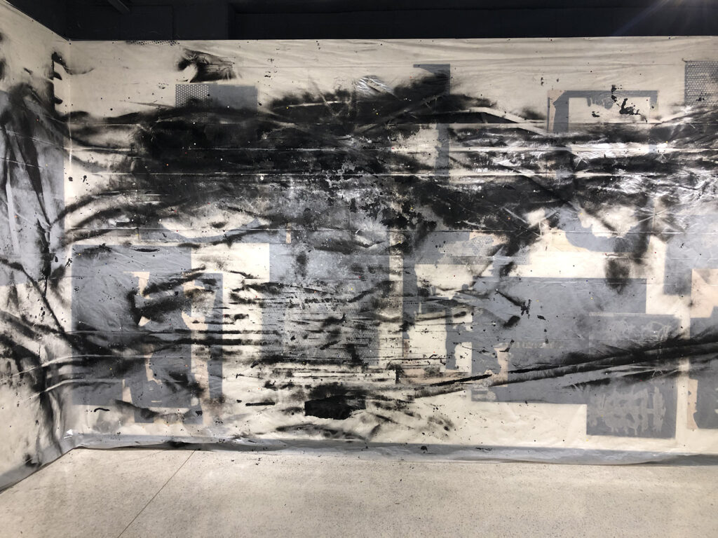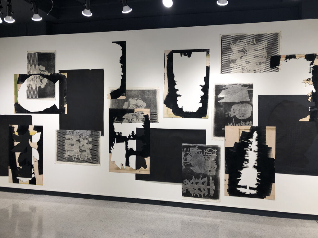 An essential by-product of my creative activity is an abundance of printed remnants, or visual leftovers. Accumulated failures, incidents and accidents (on paper) acquire involuntary visual connotations. Surfaces possessing this quality are continually re-printed or recycled, creating unforeseen visual phenomena and fluctuating conceptual circumstances. The natural condition of all printmaking processes is that of degradation, and it has traditionally been the printmaker’s job to control this trait (as long as possible). Within my studio practice I have sought to embrace this tendency rather than fight against it. It is in this and the other inherent qualities of the medium, namely, the mediation and accumulation of marks, as well as the transferal/reversal of information that provides both technical challenges and visual novelty.