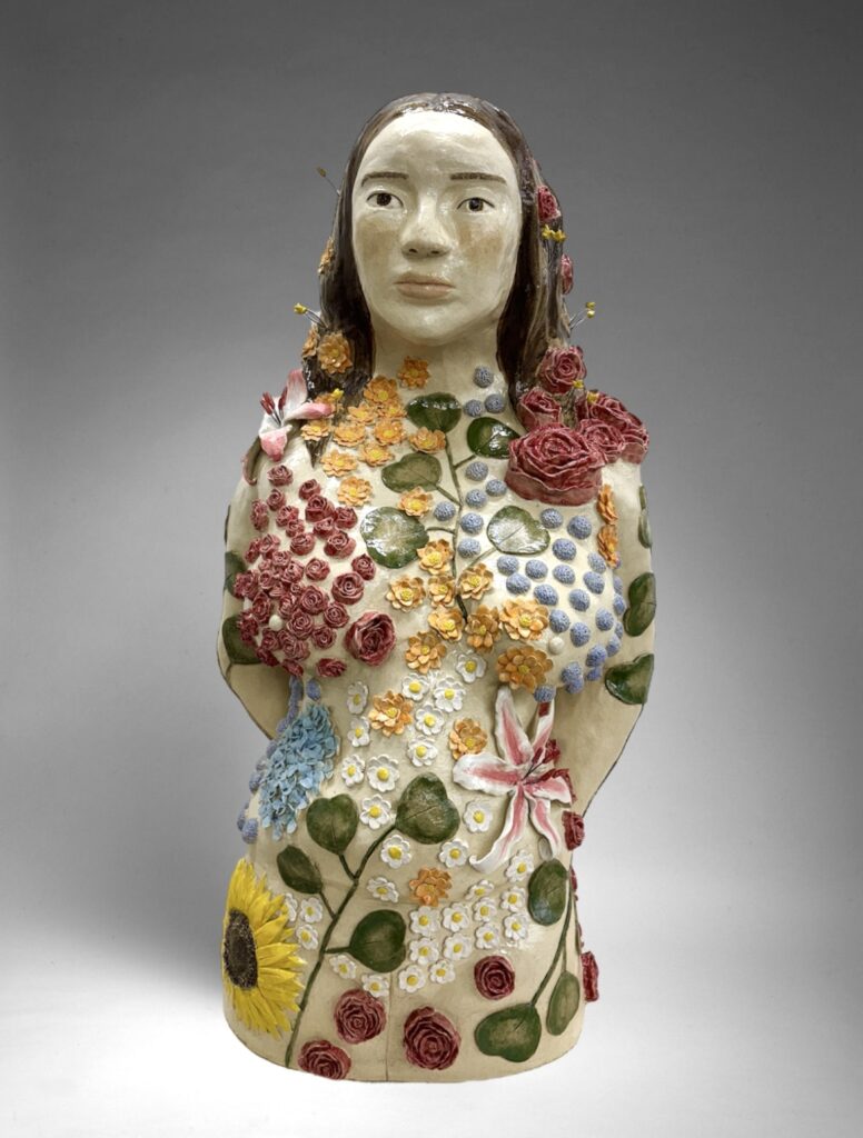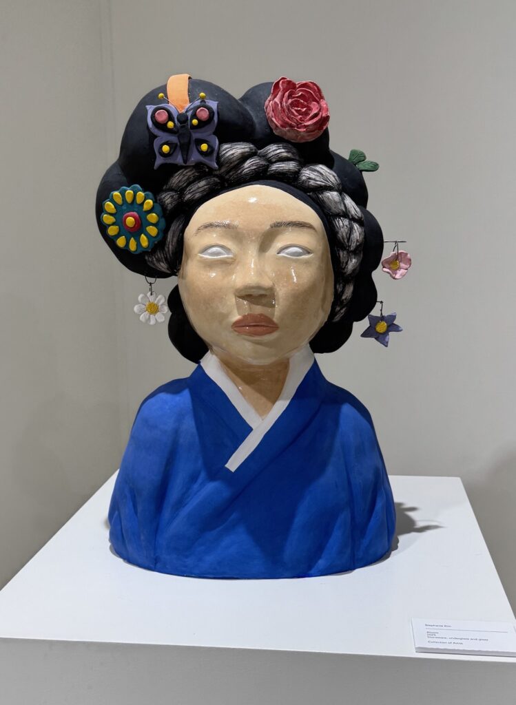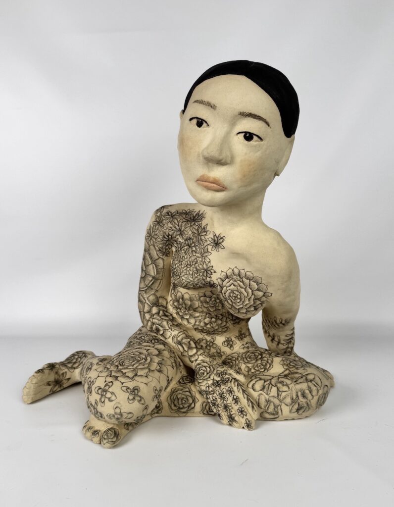 My work is a coming-of-age story as a Korean American. Like many other Korean Americans, I grapple with my identity. My experience is that of being Korean American but witnessing my “Koreanness” slowly dissipate as time goes on. When I go back to Korea, I realize how American I really am. I can interact with locals, but I stumble to find the right words. I feel a sense of loss, quite literally with my Korean vocabulary, but also a longing to strengthen my Korean side. I show this in my figurative work, referencing traditional Korean aesthetics but with unrealistic proportions and haunting eyes; it feels Korean but not completely. Self-portrait sculptures covered in celadon carvings show a reaching desire to connect back to Korean roots.
