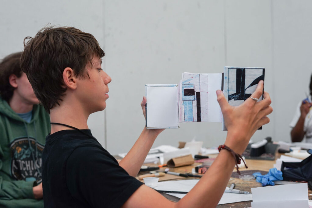 Explore the world of printmaking through linocuts, woodcuts, monoprints, and more. Then turn your prints into handcrafted artist books, so you leave camp with your own mini collection of unique journals and artwork.